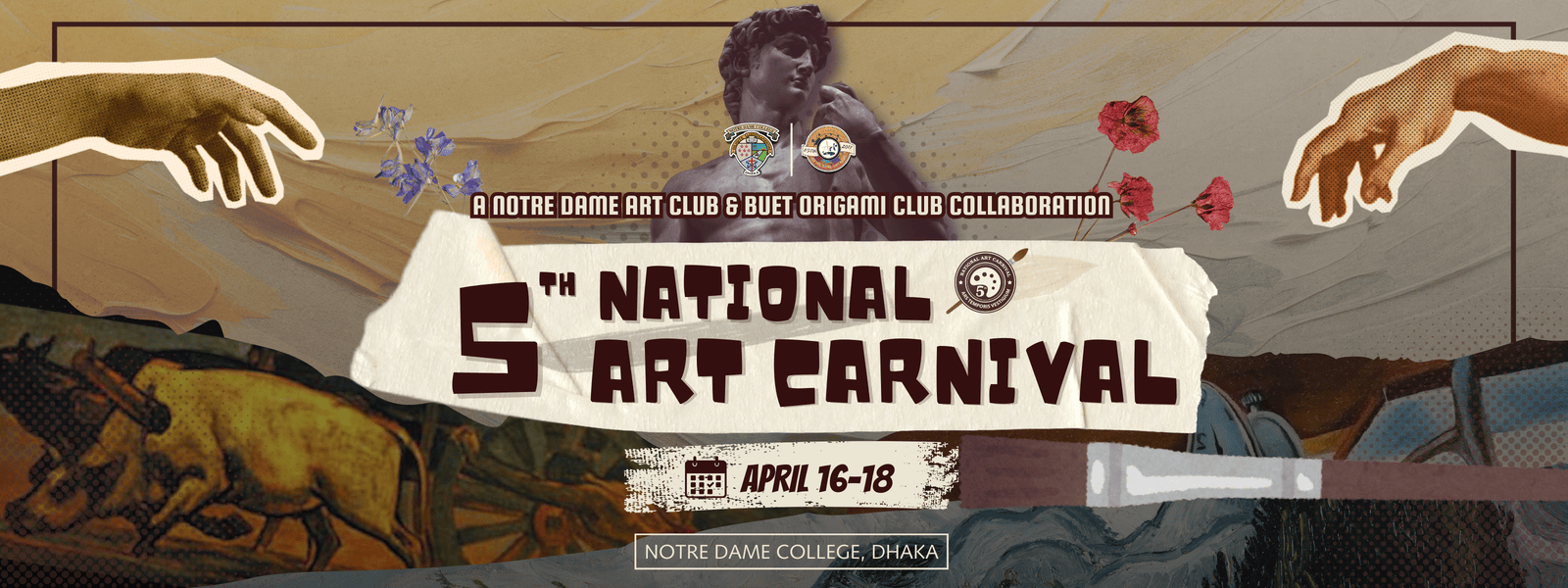 Teeming with imagination? Lacking a space to showcase the wonders of mind? Alright, buckle up as Notre Dame Art Club presents you with the 5th National Art Carnival 2026. Three vibrant days and witness the blast of imagination, culture and collaboration. Consisting of a myriad of on-spot competitions, workshops, and submission-based events ranging from traditional art to digital creations, this is the chance to showcase your unique artistic flair. Join us to be a part of this amazing journey and make unforgettable memories in a space brimming with color, passion, and inspiration!